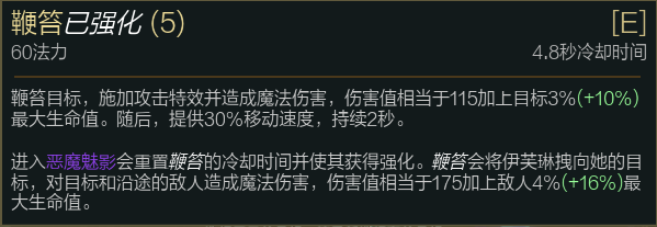 在装备成型后,E技能的百分比伤害会很高,特别是在强化后的,能够打出20%的最大生命值伤害,这对于脆皮和坦克来说都是非常恐怖的。