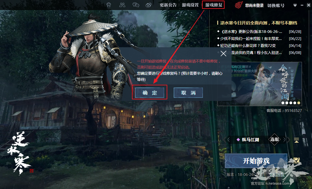 您可以在逆水寒启动器界面如下位置找到客户端资源修复功能。修复过程中请耐心等待,不要中断或关闭修复进程。