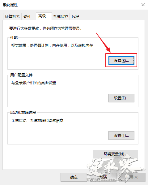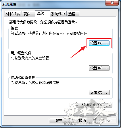 3、 在系统属性窗口中,切换到【高级】选项卡,单击打开【性能】部分的【设置】。