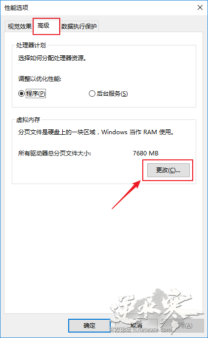 4、 在性能选项窗口中,切换到【高级】选项卡,单击打开【虚拟内存】部分的【更改】。