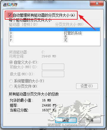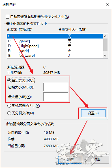 6、 然后选择想要分配虚拟内存的盘符,然后选择自定义大小,推荐设置虚拟内存大小是您机器物理内存的1. 5 倍到 2 倍。比如您的机器的物理内存是8G(8192MB),虚拟内存最大值推荐设置到12288MB~16384MB。您也可以根据机器实际情况进行调整。然后点击设置,最后点击确定。