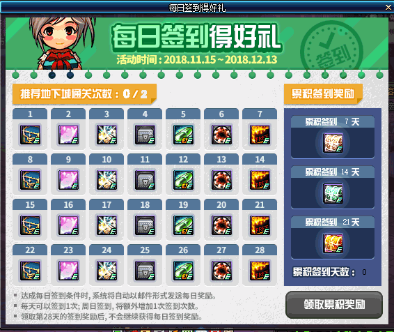 每日签到的福利只有强化器和深渊通行证值得一看,但是最突出的就是累计签到礼盒,7天的累计礼盒可以获得一个每日签到史诗礼盒,14天的签到可以获得品级箱和锻造炉,这个锻造炉可要充分利用起来,毕竟气息真的是太难得了,让人心烦的就是每天都要签到,不能补签,不过只要签到21次就能获得累计签到礼盒,可以有7天不用签到哦