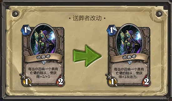 说到削弱,自然不得不提曾经最IMBA的卡组送葬猎了,只要1费下了这个,对面解不掉就可以直接gg,所以他的削弱是在所难免的,送葬猎和当时勉强能打的送葬术一起在炉石传说的历史上消失了。