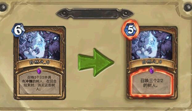 再看看看德鲁伊,以前德鲁伊有一套很强势的卡组,就是咆哮德,靠的就是自然之力和咆哮的配合,空场就有14点斩杀,如果场上有生物或者被减费了就更无敌,一回合打死的敌人不计其数,后来减了1费,但同时没了冲锋,那这张牌的价值就等于0了。