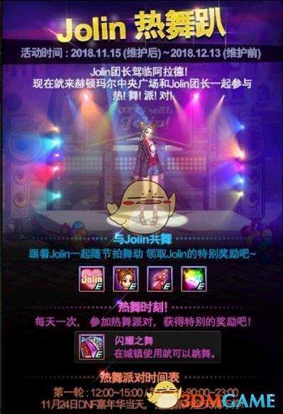 这个活动可以获得宠物和称号光环,但是这些都不重要,重要的是在热舞派对时间段内使用材料【闪耀之舞】在赫顿玛尔跳舞,有机会获得Jolin团长像素帽子装扮,看情况应该是这个Jolin团长的大头装扮,因为这个礼包需要等到29号才能开启,所以具体的样子还没有爆料,不过游戏玩法是QQ炫舞差不多的,不会炫舞的玩家可能有点难受。