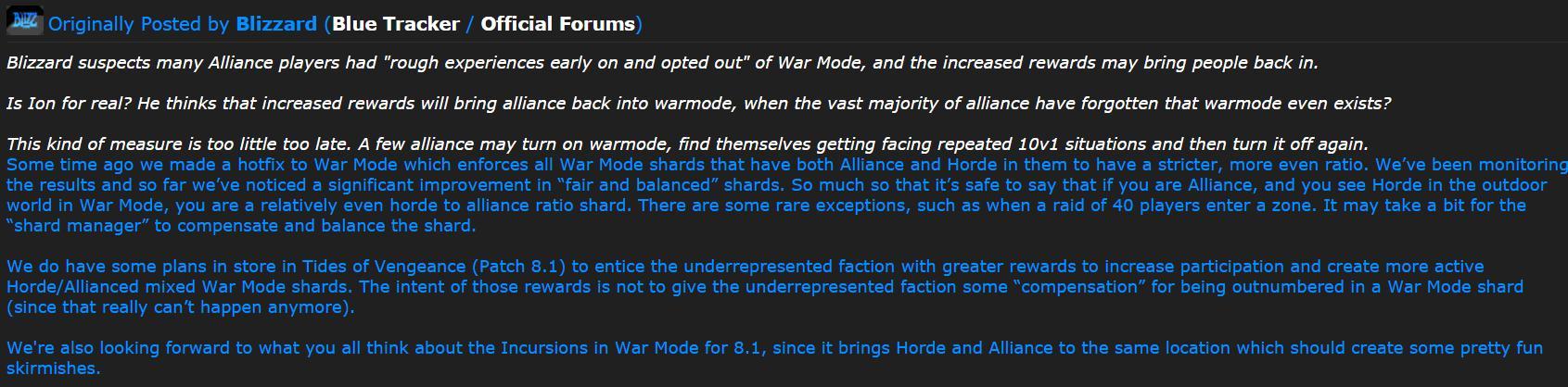 前一段时间,我们对战争模式做了一个修正,它强制所有包含联盟和部落的战争模式位面比以前有一个更严格更平衡的人数比。我们一直在监测结果,到目前为止,我们注意到在“公平和平衡”的位面里已经有了很大的改善。十分保守的说如果你作为一名联盟玩家,你在战争模式的位面下户外看到部落的人数比率现在是相对均衡的。但也有一些例外的情况,比如当40名玩家组成Raid进入一个区域时。位面管理系统可能需要一点时间来补偿和平衡当前位面的人数。