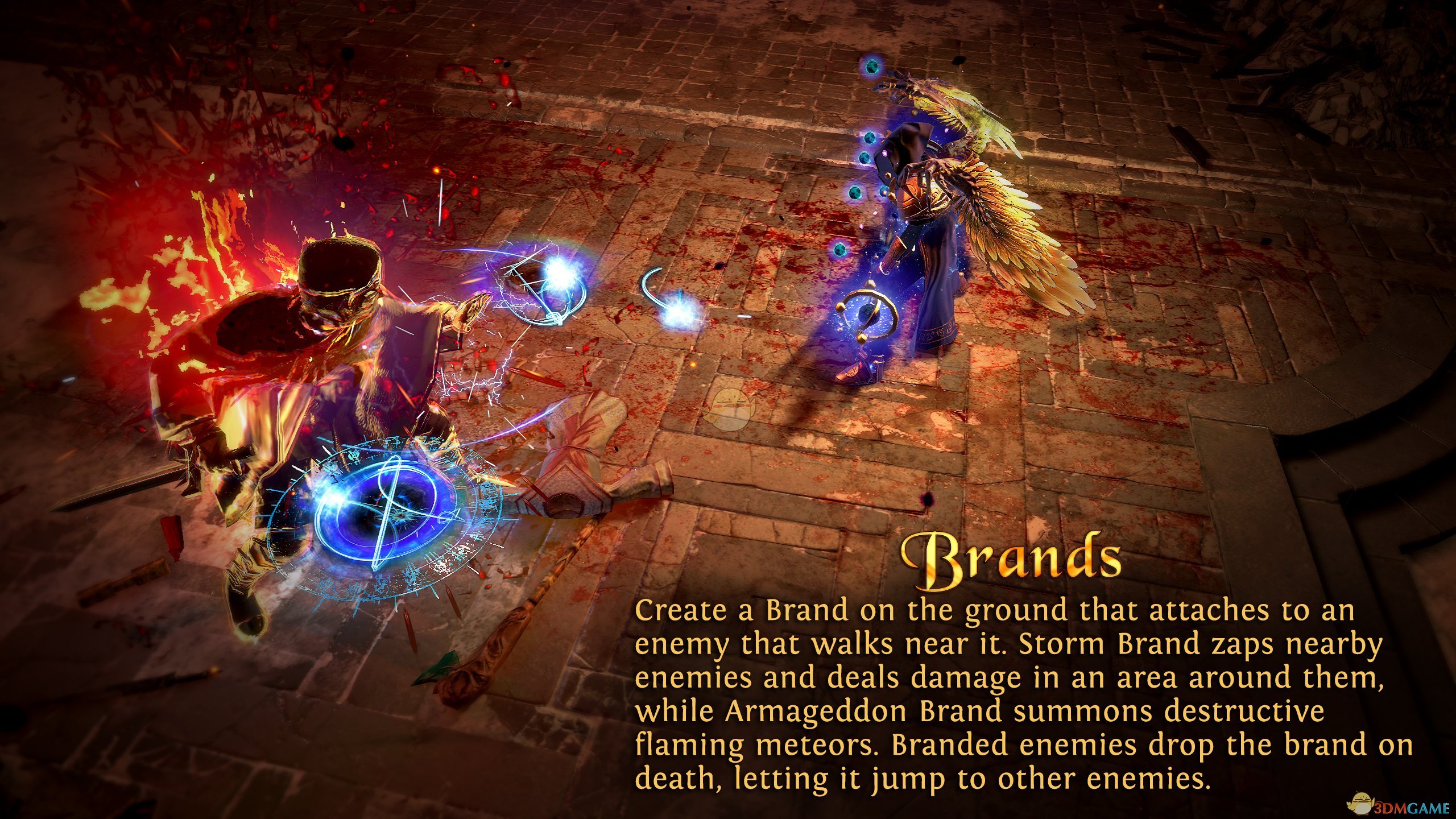 在地上施放烙印, 在敌人走上时依附在敌人身上. 风暴烙印持续对周围造成电击并对目标周围造成范围伤害. 末日烙印则是会招唤陨石. 被烙印的敌人死后会使烙印掉落在地上, 可依附其他敌人.