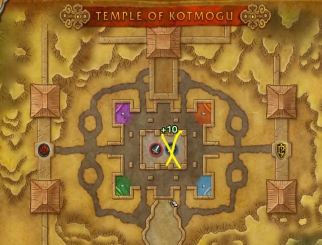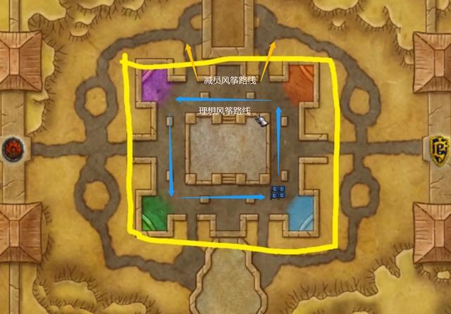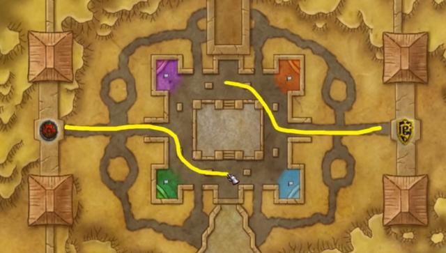 假设大部分的部落玩家都在左半场复活,小部分将在右半场复活,以下是一个进攻与撤退的路线