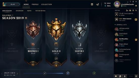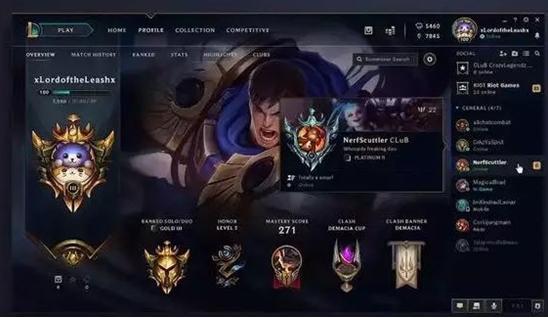 新版本中,个人资料主页召唤师图标与段位合二为一显示在界面左侧,经验等级系统则在左上方用经验条的形式展示。右侧依然是好友栏,将鼠标移到好友头像上查看好友信息,可以清楚看到好友的头像以及段位。