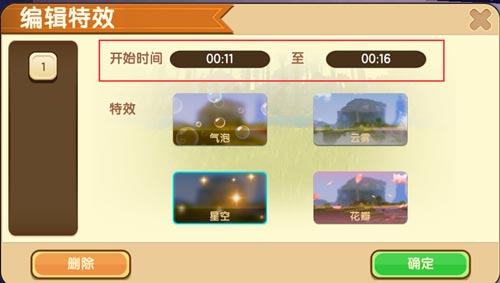 首先打开一个我们已经录制好的存档,在底下编辑栏里我们可以看到新增了一个编辑特效的功能,点开它就能选择特效啦。目前提供了气泡、云雾、星空、花瓣一共4种特效,通过设定开始到结束的时间,就可以为我们的视频添加特效啦,而且可以在不同时间段添加多个特效。