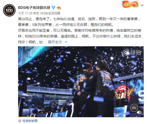尽吾志也而不能至者,可以无悔矣。感谢你对电竞带来的热情,给后辈树立的榜样,和给EDG带来的荣耀。追逐的路上,明凯,不论你做什么抉择,我们永远支持你!明凯,加油!#EDG纵情燃烧,生命闪耀#