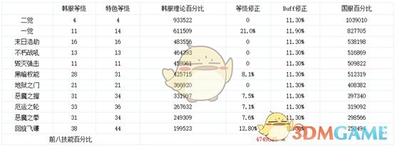 不计入白金徽章、王座以及时装上衣的等级提升,计入国服特色两级镰刀精通,恶魔诅咒,恶魔唤醒的等级提升,堕落之魂韩服取三绿皮73%技能攻击力,国服取四绿皮完美换装74%技能攻击力。一觉被动恶魔唤醒对一觉终结技审判有着独立的加成数据,因此将审判和一般技能分开进行计算。