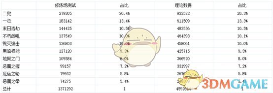 表2.主要伤害技能理论数据与修炼场伤害分布表