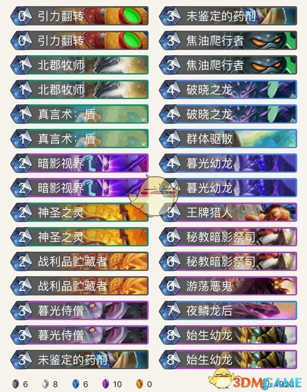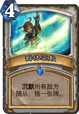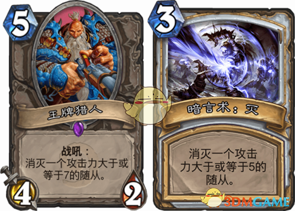 防止污染法术,牌库中有6种法术,容易3选1挤掉关键牌翻倍和群驱,而且牌组有暮光侍僧,它对三攻以上的换攻都是赚,加上暗影祭祀拉过来,所以放弃灭带王牌。其实王牌都被我分了,上月低保送一张,所以带上了,有点卡手,从低保到传说总共就蹦了一个477和一张巫妖王 。