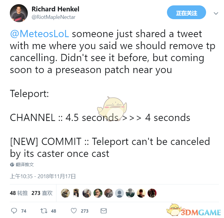 今日,拳头设计师发推,表示在新赛季将对传送做出调整。一旦使用传送之后,将不能被取消。