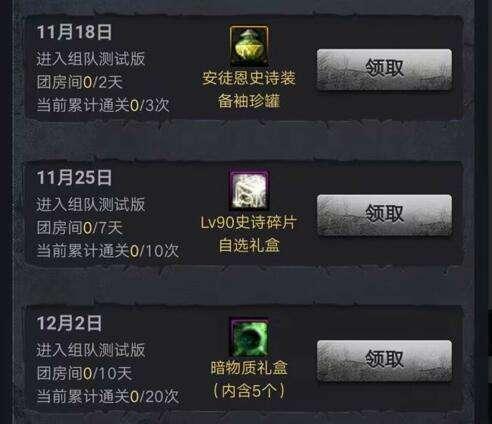 这次活动除了这些良心道具,还能获得一些终极奖励,在11月18号进入组队测试版团房间2天,并且通关3次,就可以领取到一个安图恩罐子,而在11月25号进入组队测试版团房间满7天,累计通关10次,玩家就可以领取到一个90史诗自选碎片礼盒,12月2号进入组队测试版团房间满10天,通关次数满20次,可以获得5个暗黑质礼盒,相当于打一次团的材料。