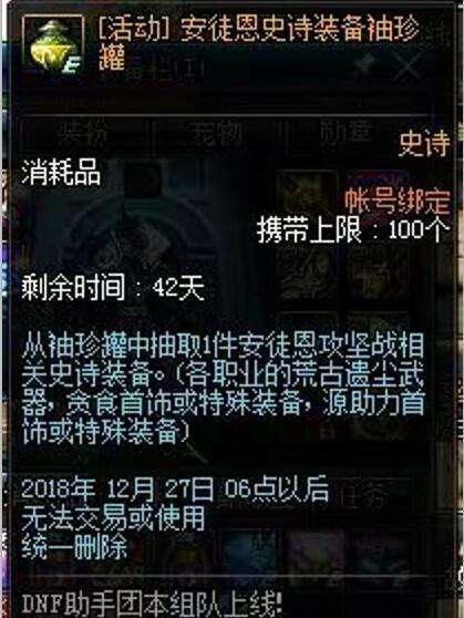 这个隐藏活动从今天开启,到下个月9号才结束,活动时间总共有20多天,玩家很轻松就能领取到这些奖励,大家不仅能剩下很多打团门票钱,还能领到但更终极奖励,其中这个安图恩史诗装备罐子算是最好的,和之前红豆兑换的礼盒一样,可以随机获得一件安图恩装备,运气好的话就能直接开出荒古武器,或贪食首饰等等。