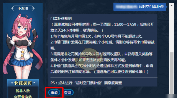 每个角色每月可申请1次,但每个QQ号每月不能超过3次,不是每天都有,用完就不能申请。申请门票补发需在门票消耗1个小时后。需满足非处罚类掉线导致未及时返回攻坚队,未获得通关奖励等条件才会补发,如果无法补发改天再战。补偿门票道具会在24小时内会通过邮件方式发送到邮箱中,申请后请时刻关注邮箱动态哦。