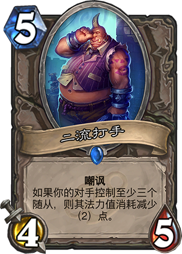 就慢速来说,这张卡的防御性比焦油差一些,需条件触发,还要前期一定抽到,否者大概率被白吃。这卡可以对比加基森版本的二流打手,也是需要对面站场数量的特效触发,三流是减2费,虽然3个随从的条件更苛刻,但自己身材可以,减费可赚节奏,所以曾进入各种慢速卡组的构筑,而好斗的侏儒,谨慎看好吧。