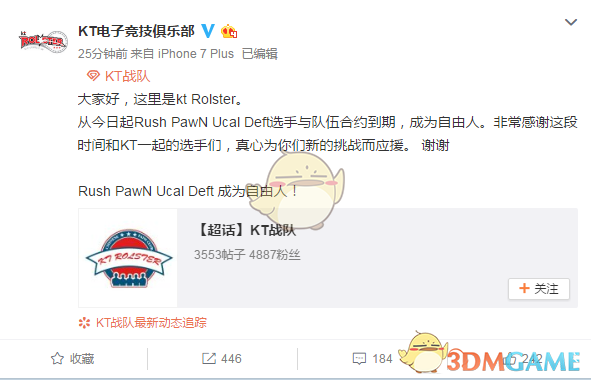 从今日起Rush PawN Ucal Deft选手与队伍合约到期,成为自由人。非常感谢这段时间和KT一起的选手们,真心为你们新的挑战而应援。 谢谢