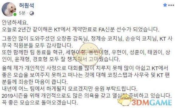 大家好我结束了和KT两年的合约成为了自由人感谢这段时间帮助我的监督教练和KT的工作人员们,还有一起的队员们谢谢你们,今年因为我个人的原因没怎么上场,很遗憾没有能在KT展现好的面貌就离开了,对于KT的工作人员和事务局还有KT的粉丝们感到抱歉,明年不还不知道会去到那个队伍但是拜托大家多多支持我,对于2019赛季我个人也怀抱着很大的野心正在认真的准备,一定会以更好的面貌回来的。