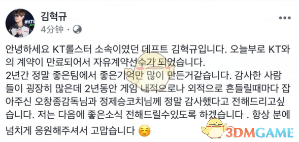大家好我是KT的Deft,今天我和KT的合约结束成为了自由人