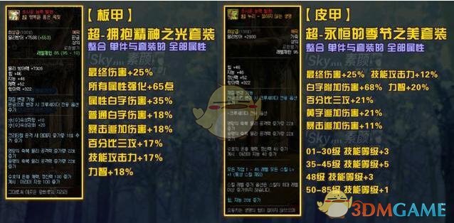 然后在皮、重、板三套防具中,首先不得不说的是,95重甲(324%)目前的属性不适合男漫游,不排除后续改版的可能,但这里无法就其改版可能出现的形态做出分析。板甲(361%)整体提升均衡;皮甲则存在较多的技能区间划分(1-30级349%,35-45级369%,50-80级342%,85级378%);95皮甲对男漫游而言是不弱的,其提升最大的35-45技能,正好是男漫游在兼顾续航与爆发时、形态最好的几个技能;同时也有3级小被动的加成,在手感方面是很不错的。但从整体伤害输出量来讲,皮甲还是略逊于板甲,这里就把板甲拿出来做比较。