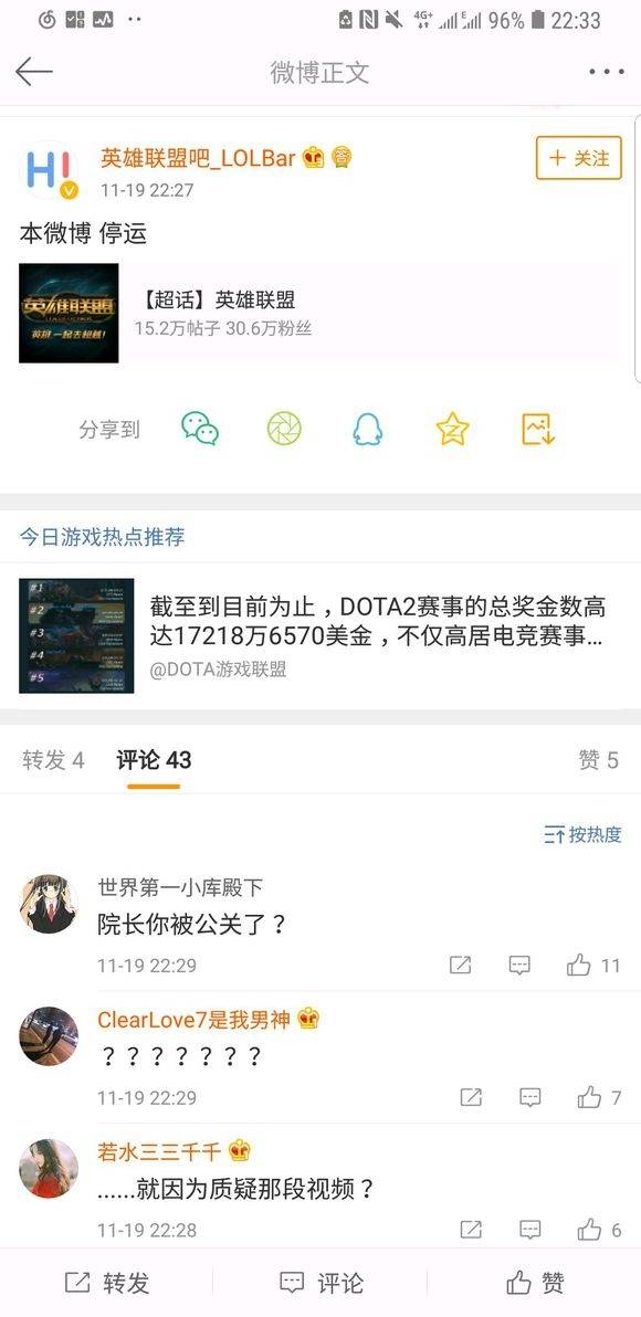 因为是LOL贴吧的官方微博,所以引发了大量的讨论。但是没想到凌晨分享的时候,到了晚上十点多,微博号就没了。在11月19日晚上十点半左右,lol吧官方微博突然宣布:本微博,停运。遭到了不少网友的怀疑,是不是被公关了,还是收到律师函了?就是因为质疑了那段视频吗?