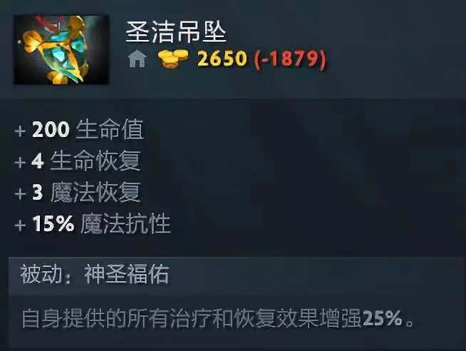 “恐鳌之戒”售价700金。提供+3.75点/秒生命恢复和+150点生命。可以升级成恐鳌之心和圣洁吊坠我们着重介绍的是他合成后的物品,圣洁吊坠。这个“圣洁吊坠”绝对会是7.20一些奶妈必备道具!因为它具有被动效果。使自身提供的所有治疗和恢复效果增强25% ,而且合成圆滑,预测它将成为版本热门辅助装备。