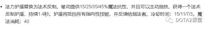 重做了敌法的被动,现在变成了一个类似于小强的尖刺外壳的技能,不过更加厉害,可以抵挡并且反弹一切指向性技能,虽然持续时间只有1.4秒,但冷却时间只有3秒。这让敌法有点无解的感觉,之前杀敌法好用的一些点控以后都不太好用了,要么开雾跳羊先手,要么卡这个技能冷却的1.6秒真空期。像斯温、骷髅王、vs的锤子想锤到敌法以后就太难了。