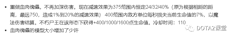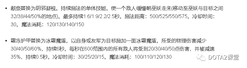 巫妖2技能和3技能都被重做替换。新版本的2技能可以给自己或者队友增加一个护盾,减少受到的60%物理伤害,好变态的技能,打团给己方被集火或者被对方大哥输出的英雄一个护盾,基本就难死了,冷却时间还那么短。除此之外还会持续对600码范围内的敌人造成伤害和减速,简直就是加强版的冰甲。