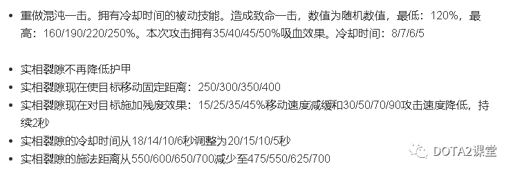 虚空的被动晕重做,一定概率触发双次攻击,类似于蚂蚁的连击,这个是物理伤害,除此之外还会有额外附加的魔法伤害。这是一个比较大的加强,这个双次攻击还可以触发暴击,新版本的虚空估计要回到复古流派,疯脸水晶剑,就能单杀一切了。当然,如果走分身散失流,这种虚空也不会缺输出了。