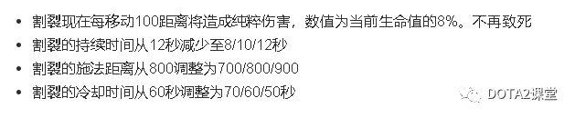 剃刀不知道是加强还是削弱了,3技能每3秒钟对500码范围内敌方所有单位造成120点伤害,这个技能加强了电棍的打钱能力和团战的aoe输出能力,但是却不再具有驱散效果。要知道以前的驱散可以驱散绿杖、虚无、全能大招等,用得好有奇效。