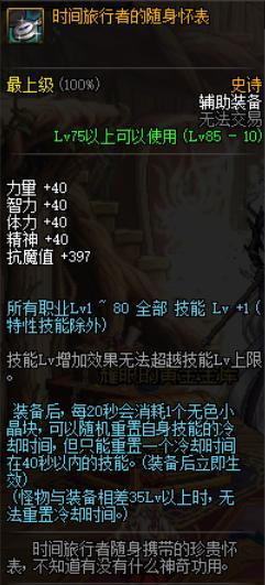 怀表绝对是第一选择,毕竟史诗套目前大家都领到2套免费的85史诗了,除非是其他号85史诗四等一的情况下会去选择防具,那么选择怀表是最好的。怀表可以用来重置技能,搭配85魔战和精炼戒指,用技能起来就是爽快。但是这不是怀表最值得换的地方,怀表可以增加1级1-80级的全部技能等级,大部分职业可以用来做BUFF换装的一件装备,选怀表绝对不会亏。