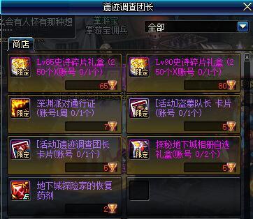 在商店中最重要的奖励是史诗碎片,85级和90级史诗碎片各250个,一共就是500个史诗碎片。另外一个周可以兑换一次深渊票,账号可兑换两张卡片,紫色品质百分百升级卡片,跟国庆活动推出的巴斯泰托一样,另外还可以兑换地下城相册2个。