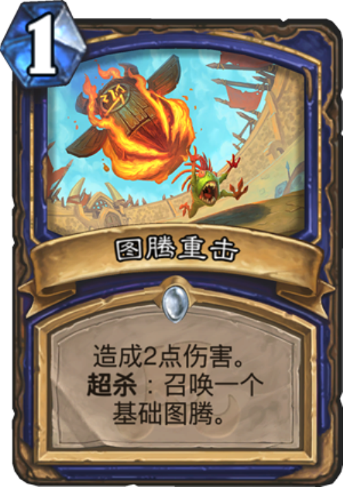 萨满普通法术。1费打2,超杀:召唤一个基础图腾,相比牧师神圣惩击、猎人奥术射击,这卡就是超模的,因为1费打2本身不亏,而配合法强或者直接击杀1血生物完成超杀,便可以召唤一个基础图腾,而且和新橙卡配合可以打3个敌人,用的好3个超杀。
