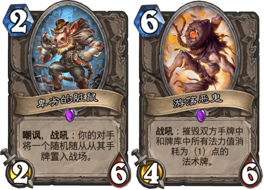 在炉石传说中,总有些卡组是积攒组件,达到后期秒人效果的作战思想。同时它们又有强大的苟活生存能力,单靠随从铺场推倒它们也变得很困难。为了拯救被“套路”中的玩家,卑劣的脏鼠和游荡恶鬼便被设计师设计出来,帮助玩家们抵抗这些“秒人”的套路。同时,在大多数版本都会出现这样的套路,于是这两张卡牌的上场率也随之很稳定。