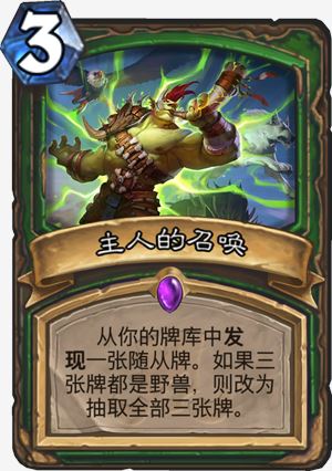 猎人史诗3 费法术 从你的牌库中发现一张随从牌。如果 3 张牌都是野兽,则改为抽取全部三张牌。