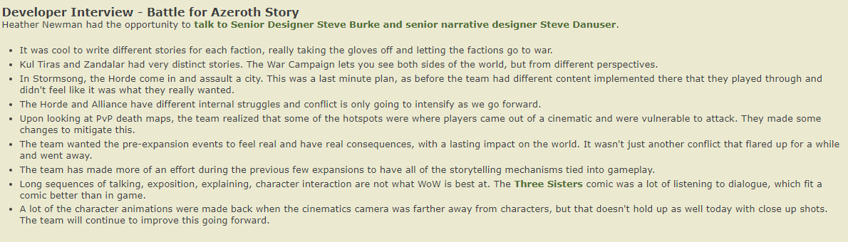 讲述长线的故事、解释背景和角色互动不是WoW(游戏中)的强项。其他方式,比如像《三姐妹》这样的漫画比起游戏本身要更适合来讲述相关的故事剧情。