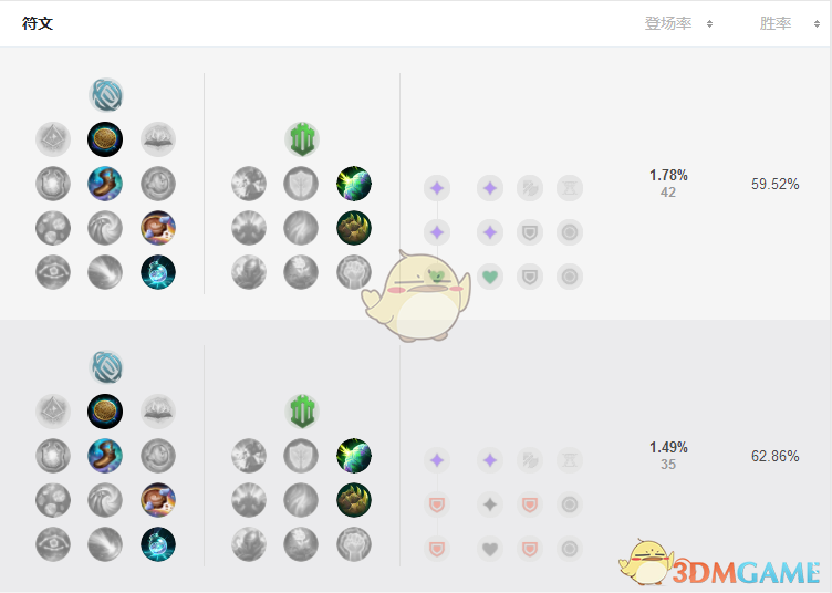 上图是维克托的符文胜率情况,从目前的情况来看,副系选择坚决系的玩法是一律选择了护盾猛击+骸骨镀层这两个符文,除了维克托以外,赛恩、厄加特这两个英雄在选择坚决系符文时,都会选择带上护盾猛击。