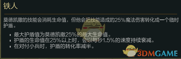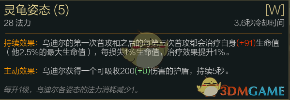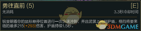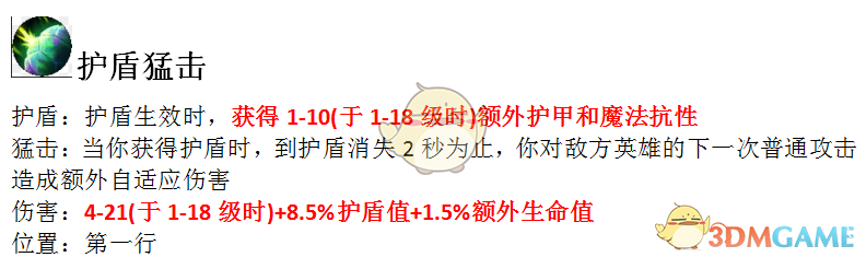先来看看护盾猛击的数据情况吧,在护盾生效后,最大能获得10点双抗,并且下一次普攻最多能造成21+8.5%+1.5%的额外生命值,没有冷却时间。