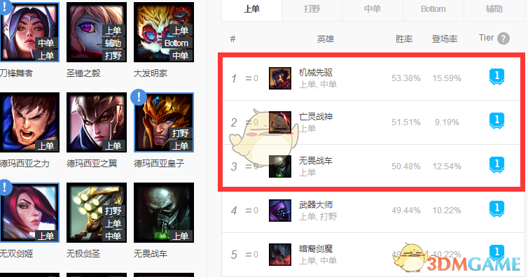 我们先来看看最近OPGG榜单上的一些变化吧,首先是常年变动最大的上单位置,上单是最能反应当前版本趋势的一个位置。从S9季前赛版本的Tier英雄来看,武器大师掉出了前三,赛恩重回T1上单位置,而维克托、厄加特这两个英雄则继续保持强势。要说这三个英雄都有什么共同的特点,那就是护盾,这三个英雄都具有护盾技能,而这个技能,恰好就能触发今天我们的主题,新坚决系符文,护盾猛击。