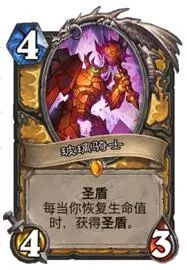 4费4/3圣盾,每当你恢复生命值,便获得圣盾,在血槽接近空了以后,配合众多奶卡,无论是自动回复还是主动回复,都可以为玻璃骑士再次提供圣盾,在塞尔卡把血槽搞空以后,灯神就可以持续回复,玻璃骑士的可怕就体现出来了,除非被秒,否则当回合攻击破圣盾,回合结束灯神奶一口,圣盾又回来了…