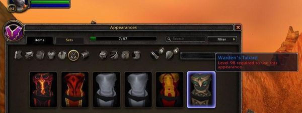如上图中的例子,这个在守望者阵营中只有中立(Neutral)声望的110级角色,他的藏品中的守望者战袍已经解锁,可以进行幻化了,而且幻化没有任何声望的要求。