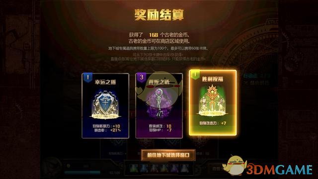打完怪物后会结算奖励,获得古老的硬币,而我们最好是点击1张卡牌后再点击前往地下城选择窗口,因为直接点击只能获得古老的金币,选择了卡牌,那么下一次挑战会加入我们选择的卡牌。
