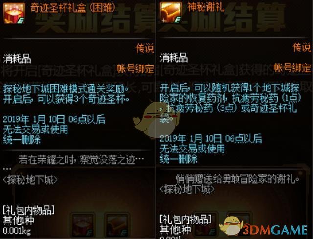 奇迹圣杯礼盒打开会获得3个奇迹圣杯,神秘谢礼礼盒随机获得药剂或者疲劳药或者奇迹圣杯礼袋