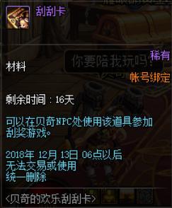首先,大家最需要了解的是次数问题,每天我们通关2次推荐的地下城后,系统会以邮件的方式给大家发送2张刮刮卡,刮刮卡以材料的形式放置在背包中,使用必须通过刮奖面板使用,而刮奖面板仅能在赛丽亚房间里的贝奇打开(正式服不会加入快捷栏还不清楚)。