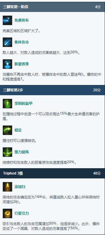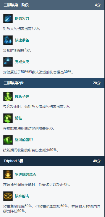 三脚架第一层增加射程,减少消耗和加强效果,前两个不说明了,主要说明下加强效果,对敌人移动效果减少20%和对种子级别以上敌人增加伤害,这估计是这个技能在pve上的唯一亮点,也就是说虽然boss免疫冰冻效果,但是也会受到增伤的效果,非常漂亮,如果你想带上这个技能,毕竟冷却时间是6s