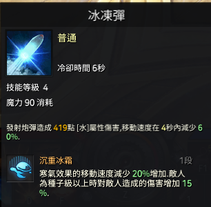 2,冰冻弹,CD6s,伤害并不高,但是却有超强的控制能力,个人觉得是PVP强技,在pve中也可对boss进行防御力的降低。