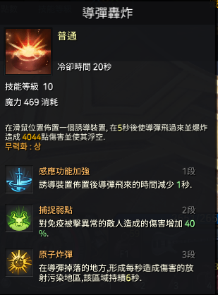 这个技能和炮塔有异曲同工之妙,但是要看好摆放位置,不然怪跑了就打空了,考虑到打boss的时候使用,一层点出增强感应加快速度,二层点捕捉弱点针对boss,三层核弹,伤害就够了